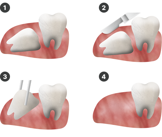 ① 매복사랑니 노출을 위해 잇몸 절개 ② 잇몸 절개 후 뼈를 제거하여 공간확보 ③ 사랑니 분할하여 순차적으로 발치 ④ 잇몸 봉합