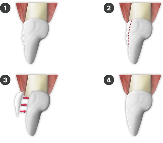 ① 라미네이트 받기 전 치아의 옆면 ② 치료받을 치아를 최소 삭제/무삭제 합니다. ③ 치아에 맞춘 라미네이트를 제작합니다. ④ 제작한 라미네이트를 접착합니다.